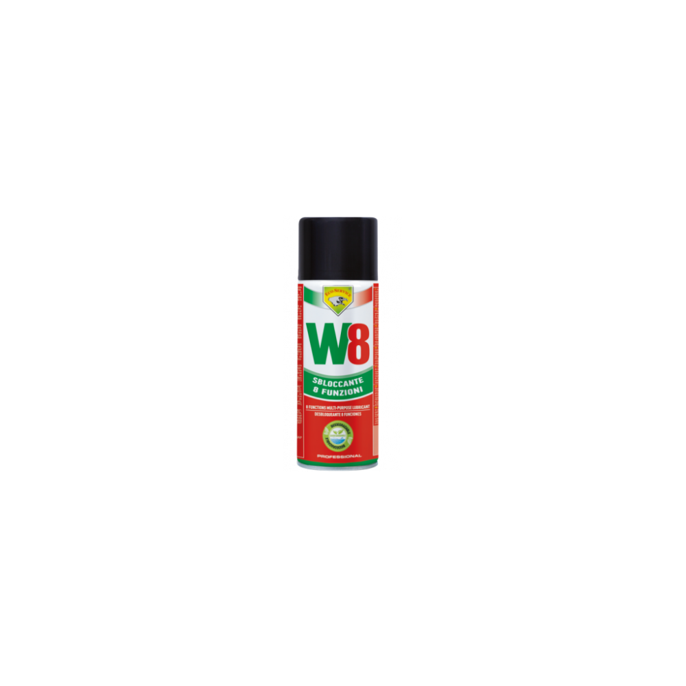 W8 Sbloccante biodegradabile otto funzioni: sbloccante, protettivo, lubrificante, idroespellente, anticongelante, sgrassante, dielettrico, anticorrosivo. W8 ha la capacità di svolgere insieme o separatamente tutte le 8 funzioni e pertanto diventa uno strumento indispensabile per il ripristino delle funzionalità di oggetti utilizzati in officina, in casa, in garage, in giardino, nella nautica, ovunque ci sia un meccanismo inceppato. Valvola erogatrice a 360° nel formato 400 ml. Non contiene tricloroetilene. Prodotto a specifiche militari: MIL-C-23411 MIL-C-16173 DEF STAN 68-10/2 NATO C-634.