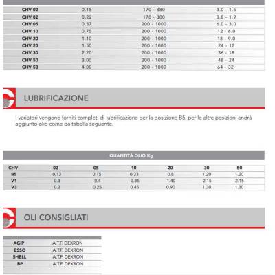 Chiaravalli Group S.p.A. presenta la sua linea di variatori meccanici a bagno d’olio serie CHV nelle grandezze 02-05-10-20-30-50, le principali caratteristiche sono le seguenti: Campo di variazione 1:5 Funzionamento uniforme e silenzioso Coppia crescente ai bassi giri Elevato rendimento Flange entrata e uscita B5 Forma compatta Casse in alluminio grandezza 02-05-10 Verniciati RAL 9022 grigio