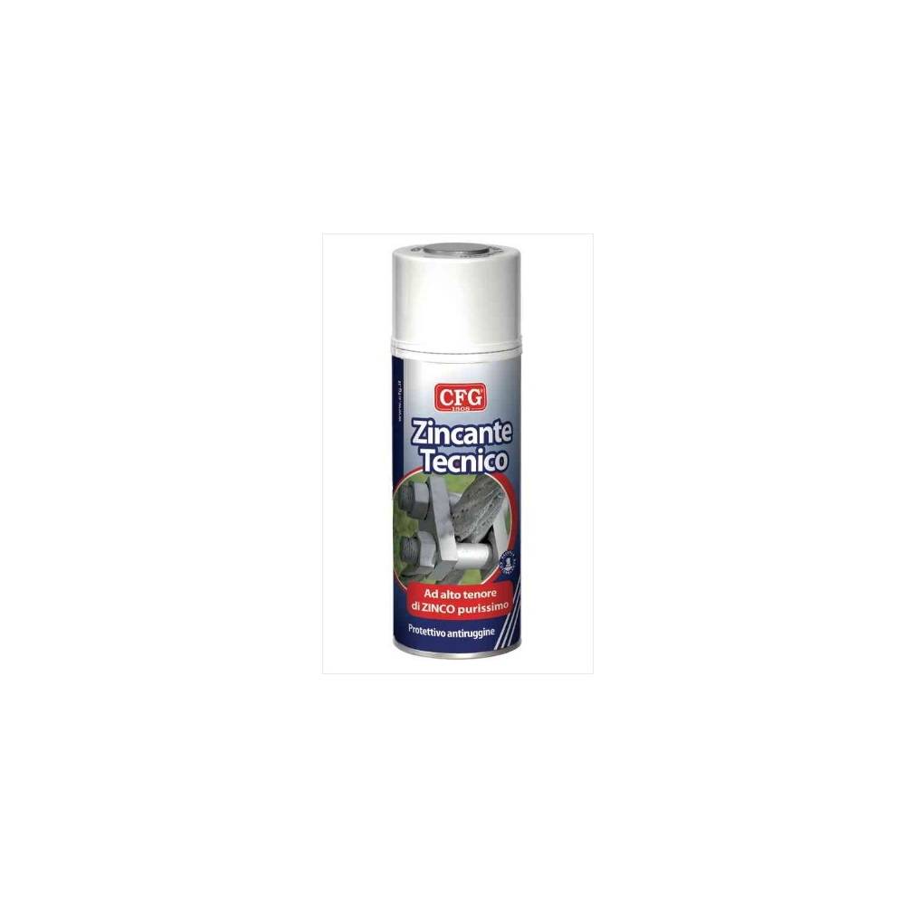 Zincante Tecnico CFG Spray 400ml ad Alto Tenore di Zinco, Protettivo Antiruggine Professionale ZINCANTE Protettivo antiruggine spray TECNICO Zincante tecnico ad alto tenore di zinco. Protettivo antiruggine a base di zinco ad alta purezza. Applicato su metalli ferrosi si lega elettrochimicamente impedendo la formazione di ossido.